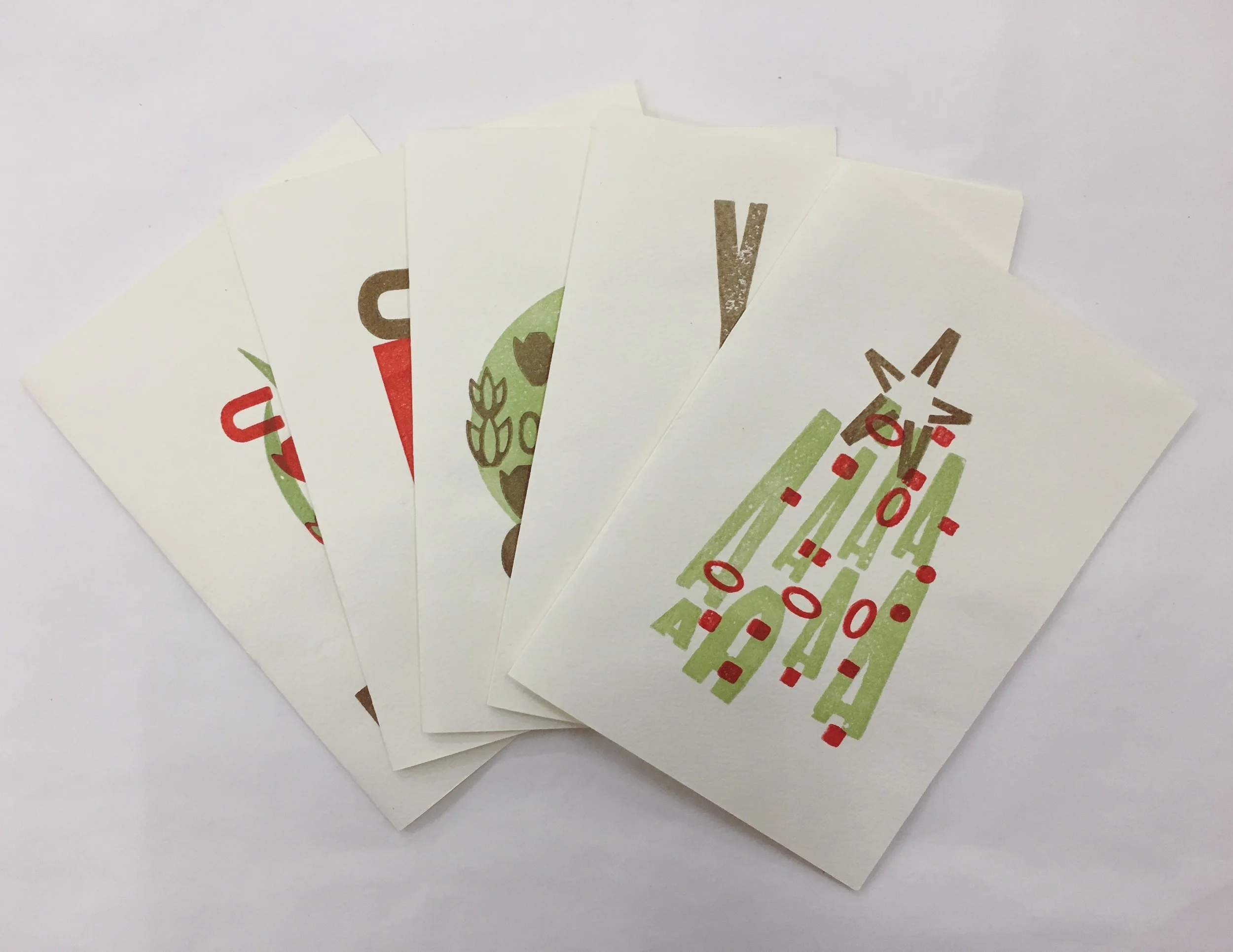 Letterforms not only help us create stories, they can also be used to illustrate. I took this concept and ran with it to create a series of five Christmas cards, each with a different design on the front. They are letterpresses with three different layers, all using different letterforms and punctuation to create common symbols of Christmas.