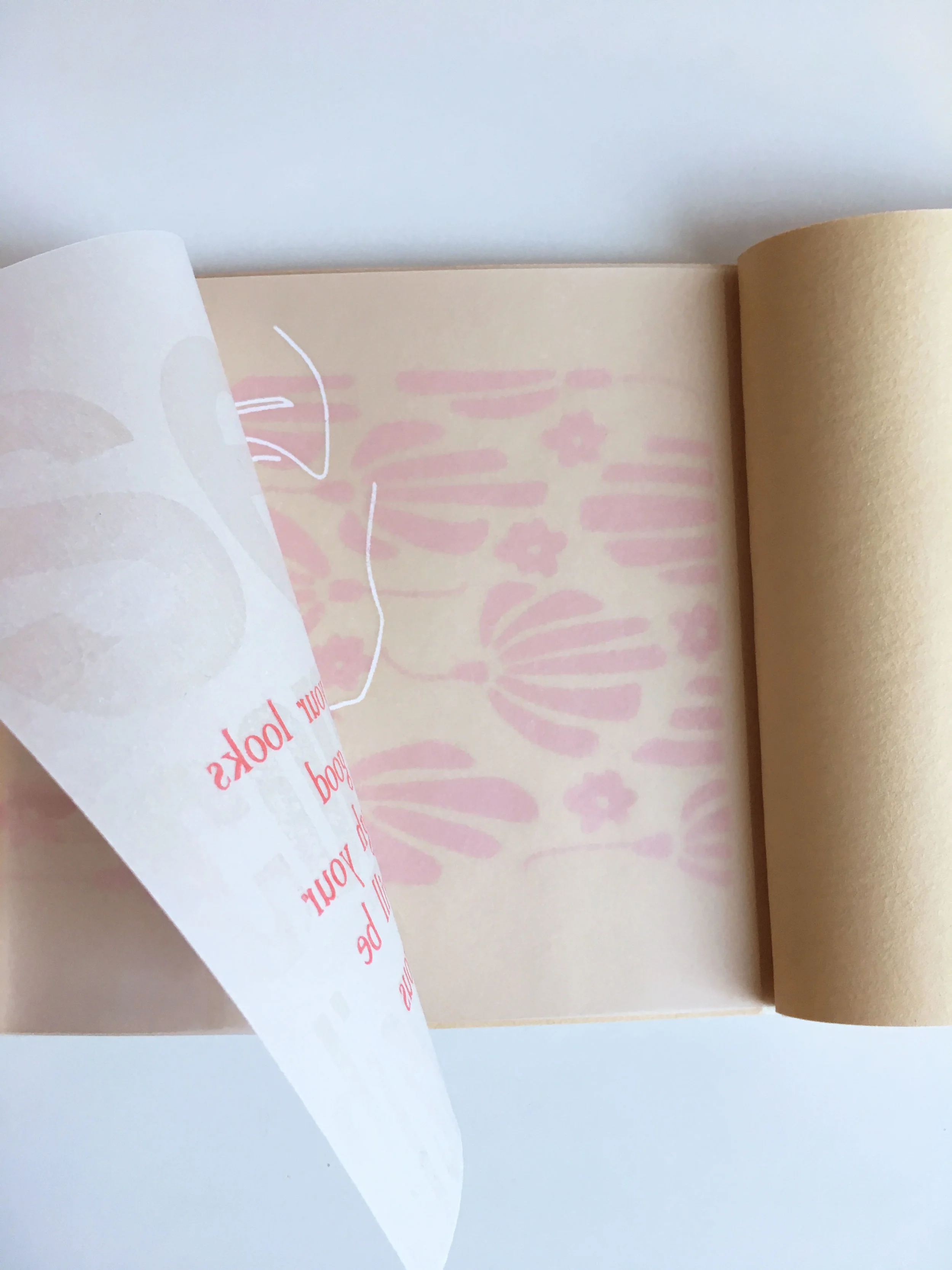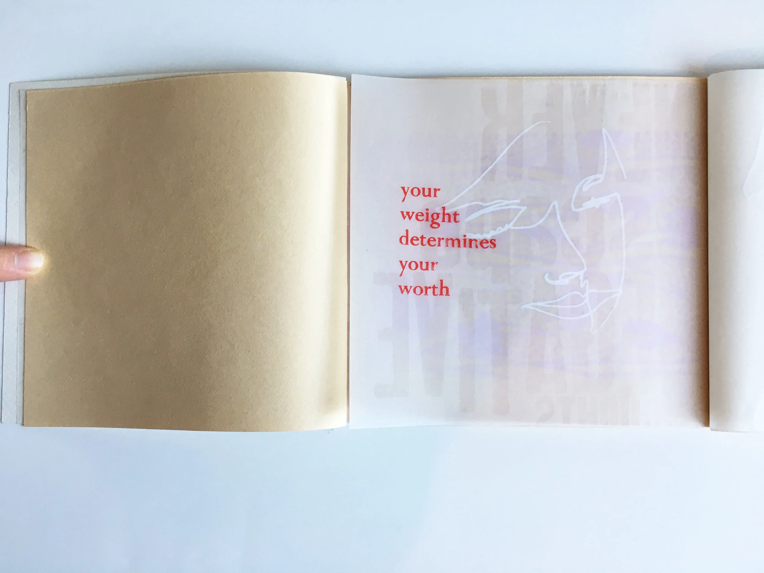 My booklet has six different mini sections; each with a letterpressed velum sheet, a screen-printed piece of velum and a screen-printed pattern on craft paper. The letterpressed pieces each have a red quote found from snippets of news articles and transparent type on the reverse reflecting my reaction to the quotes. The faces represent imperfect self-portraits blind contour drawings to show the beauty in imperfections. The third part of each section is a pattern hand drawn and screen printed in various shades of pink and purple to show the repetitiveness of these messages through society and the media. Each is hand printed which in turn creates its own imperfections because of all the mistakes that can be made along the way. And let me tell you, there were many mistakes but that became part of the beauty.