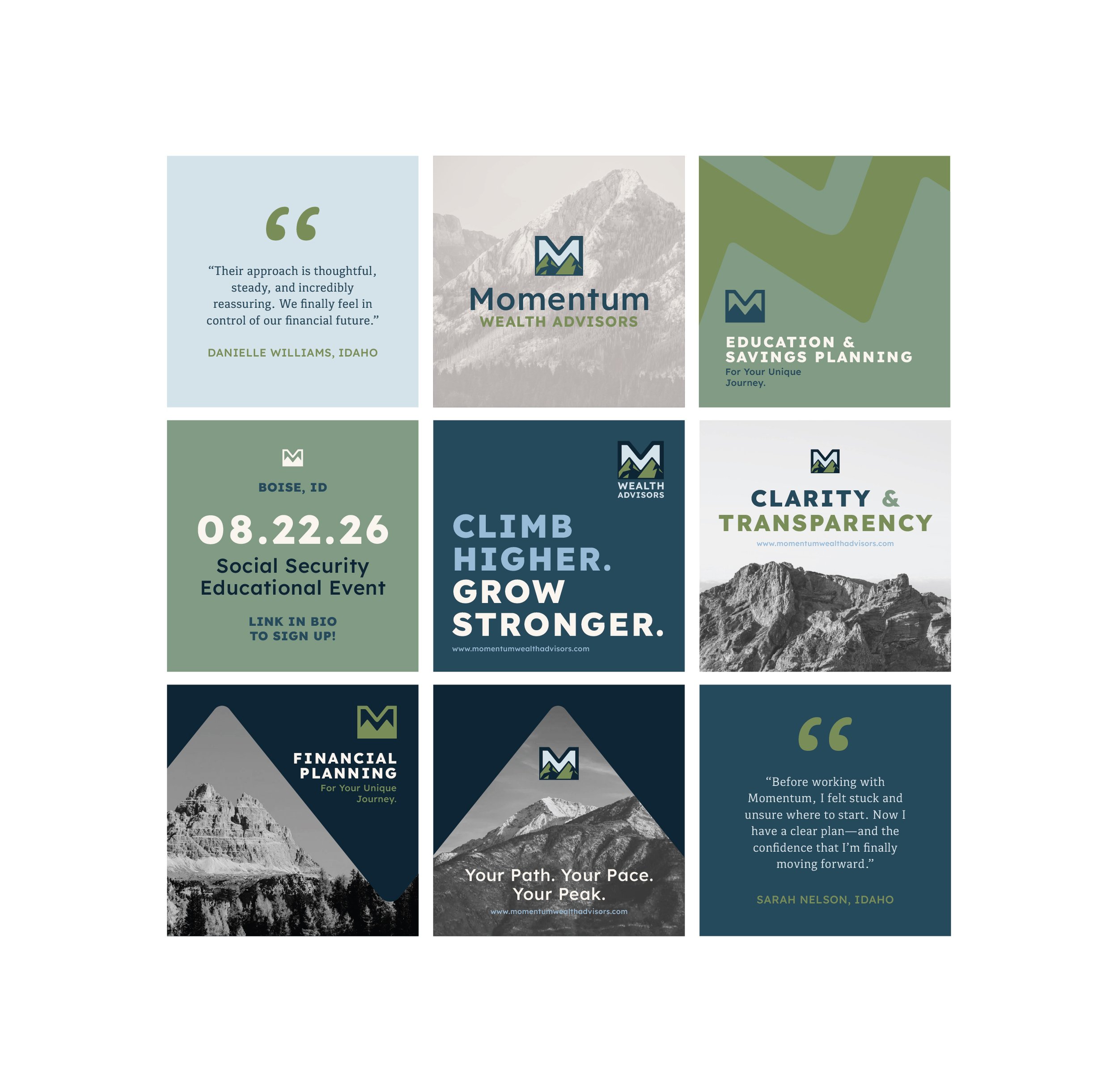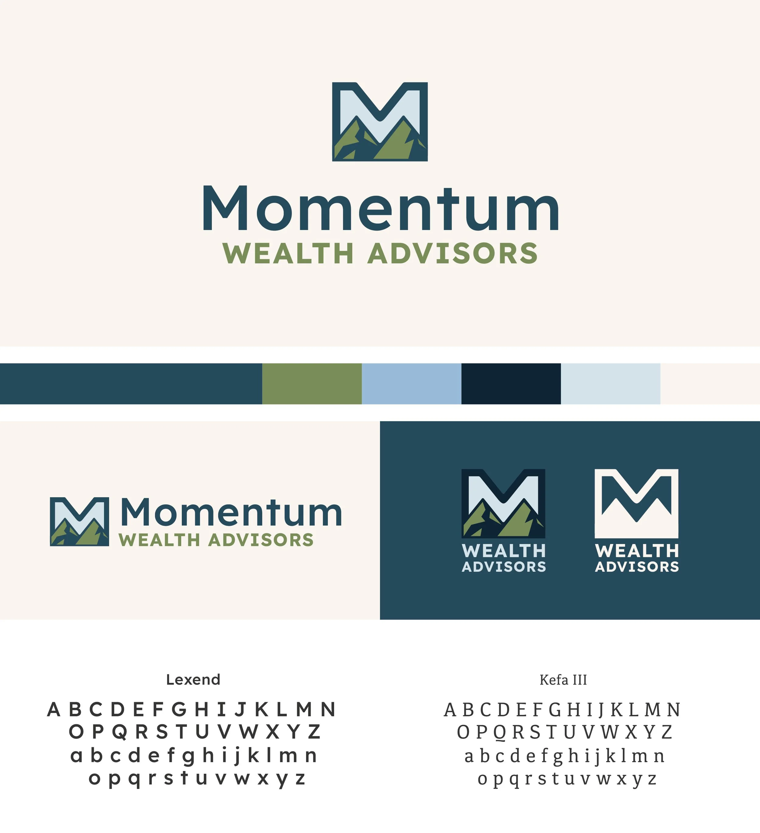 This brand was created to explore a more dynamic and directional approach to financial services. Inspired by the idea of forward movement and long-term growth, Momentum Wealth Advisors centers around guiding clients toward their goals with clarity and confidence. I focused on building a visual and verbal identity that feels strong, elevated, and purposeful, mirroring the steady progress clients aim to achieve.